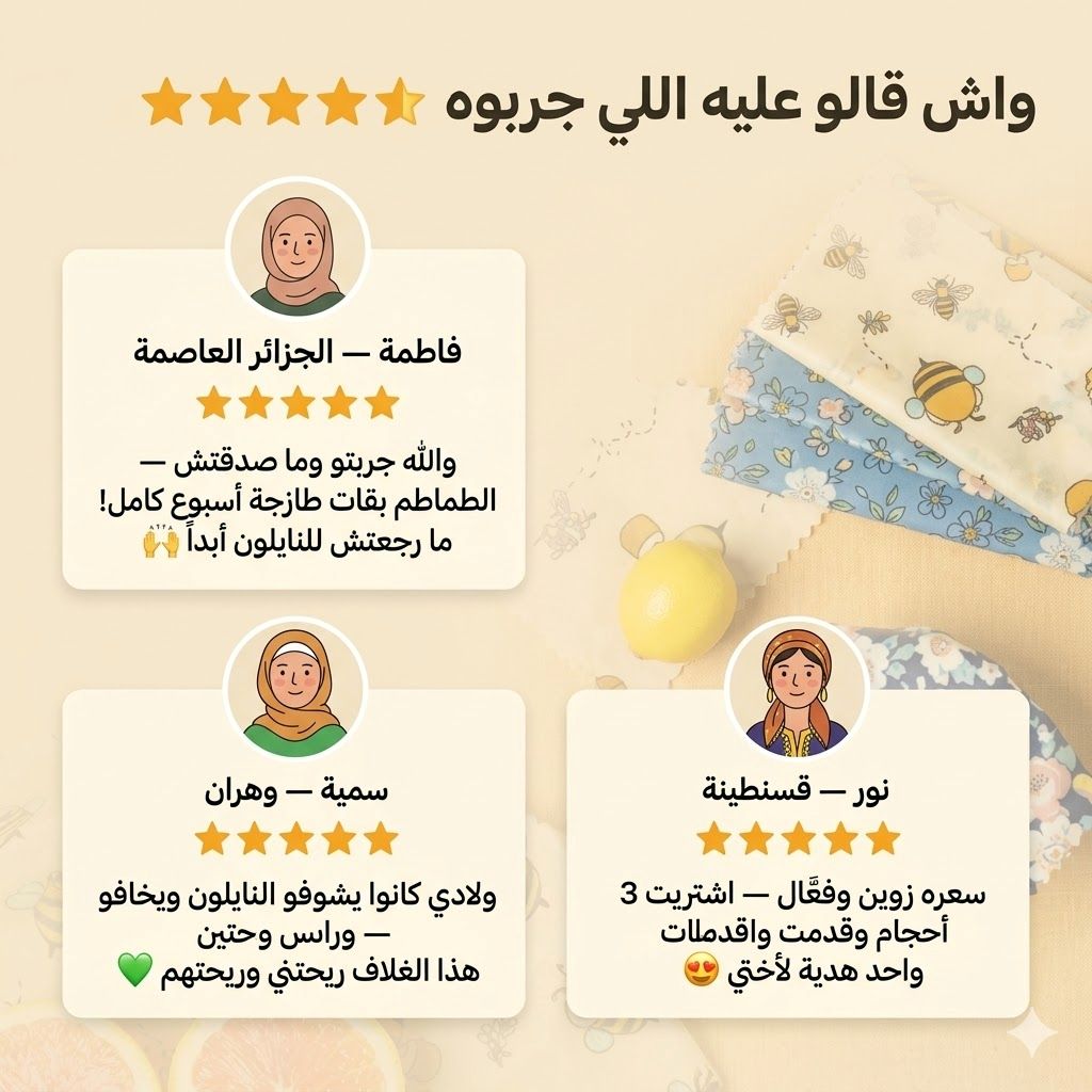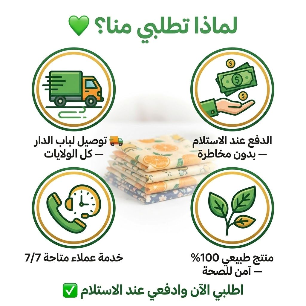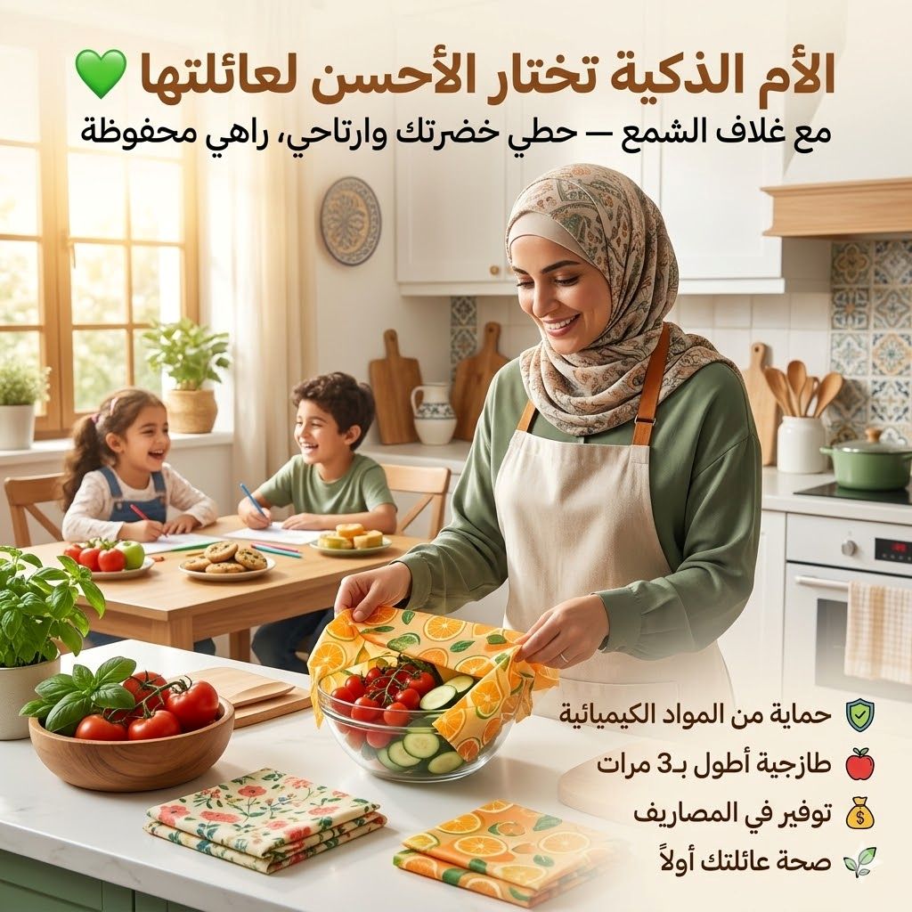جربي غلاف الشمع الطبيعي 100% — يحفظ خضرتك وفواكهك طازجة أسبوع كامل في الثلاجة 🥦🍎