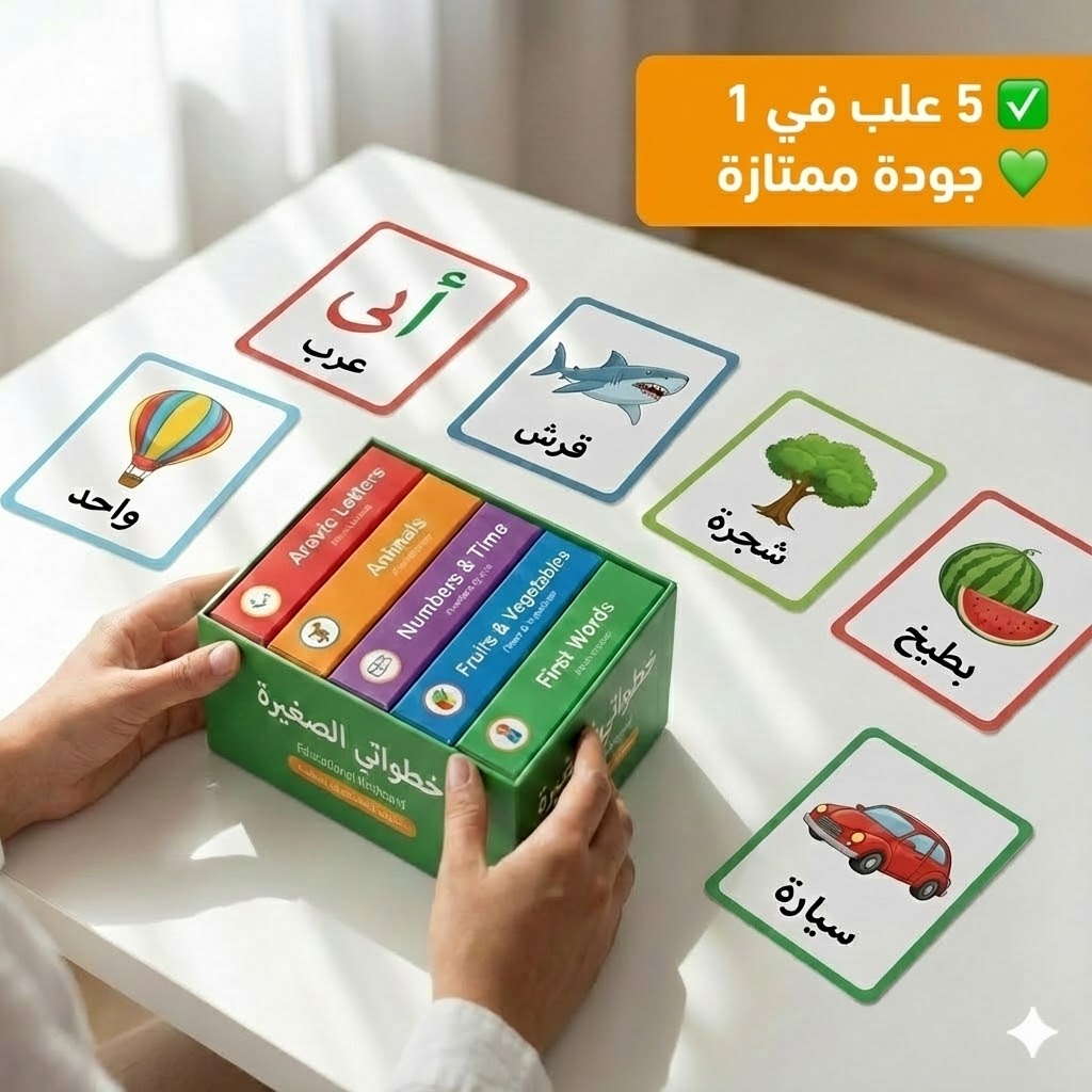 مجموعة بطاقات تعليمية متكاملة تضم 5 علب في صندوق واحد، صُمِّمت خصيصاً لمساعدة طفلك على اكتشاف العالم من حوله خطوة بخطوة 🧠💚.