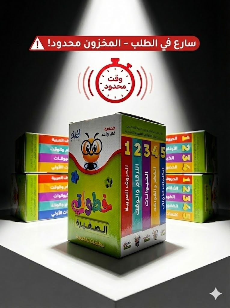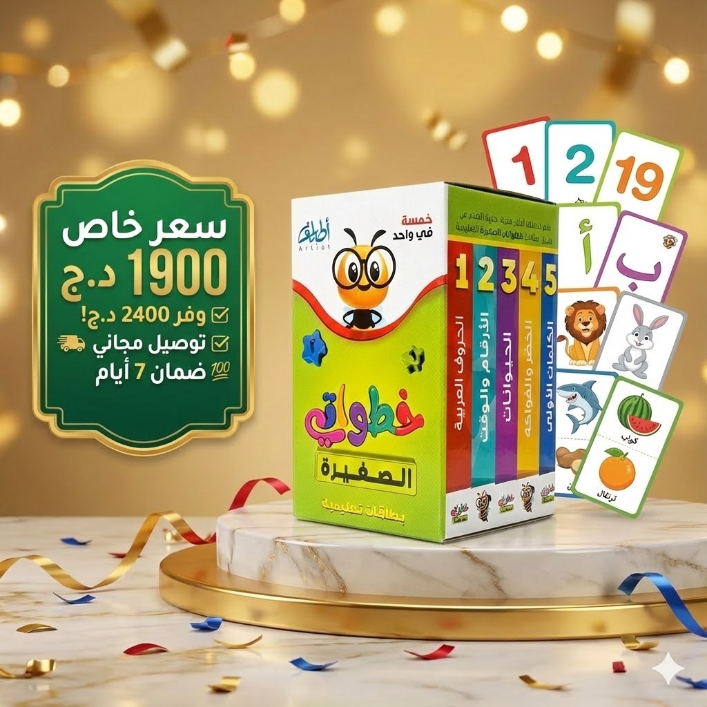 العلبة الأولى تعلّمه جميع الحروف العربية مع صور جذابة، الثانية مخصّصة لـ الأرقام وتعلّم قراءة الساعة ⏰، الثالثة تعرفه على الحيوانات وأسمائها بالعربية 🐴🦈، الرابعة تعرّفه على الفواكه والخضروات 🍎🥕، أما الخامسة فتمتلئ بـ الكلمات الأولى التي يحتاجها في حياته اليومية.
