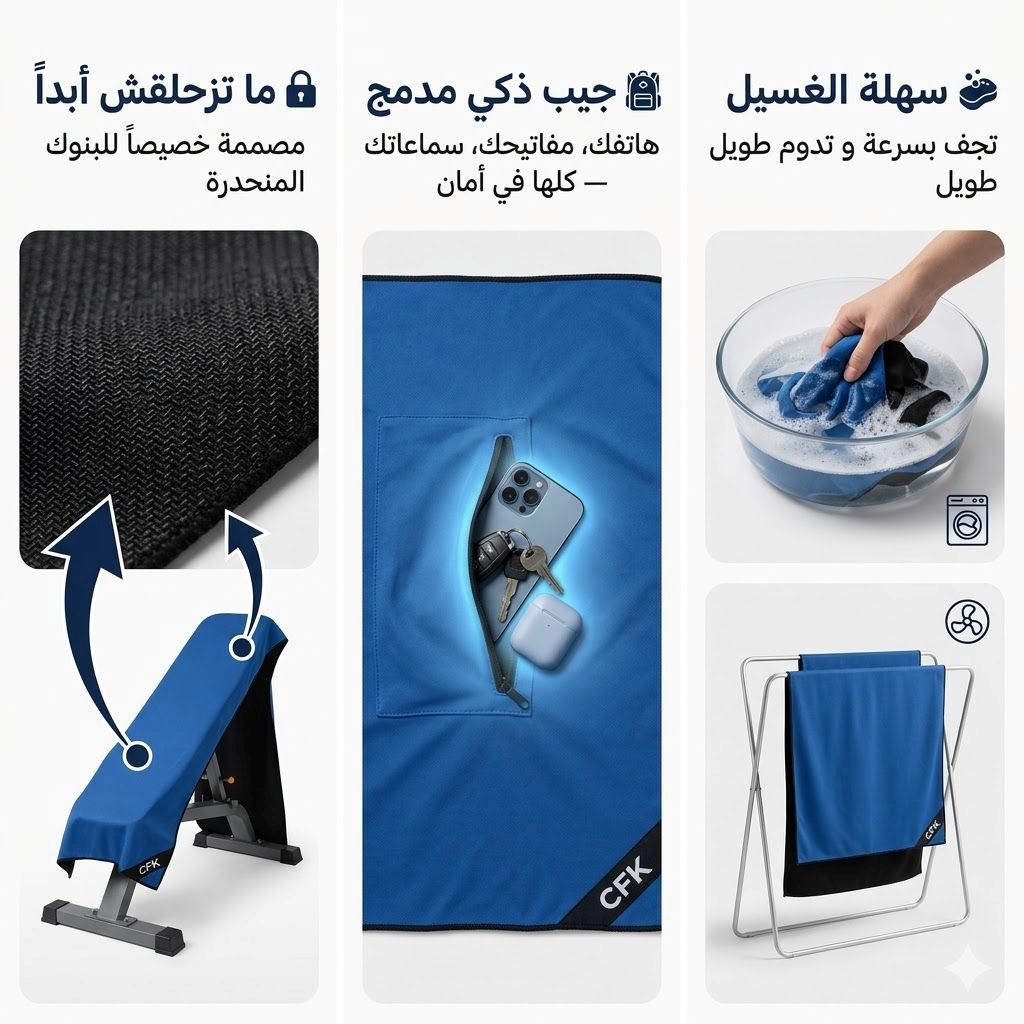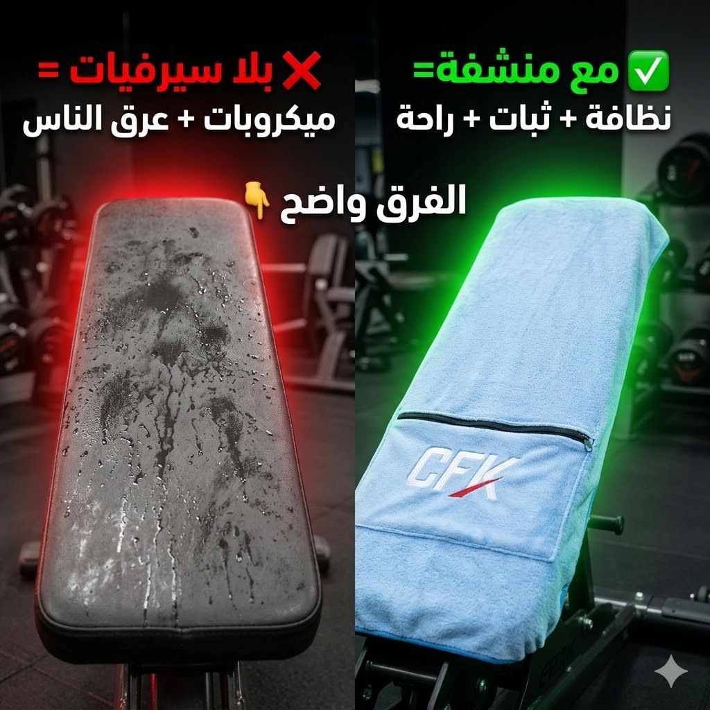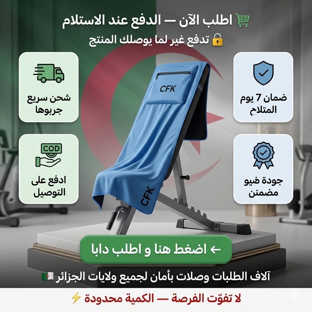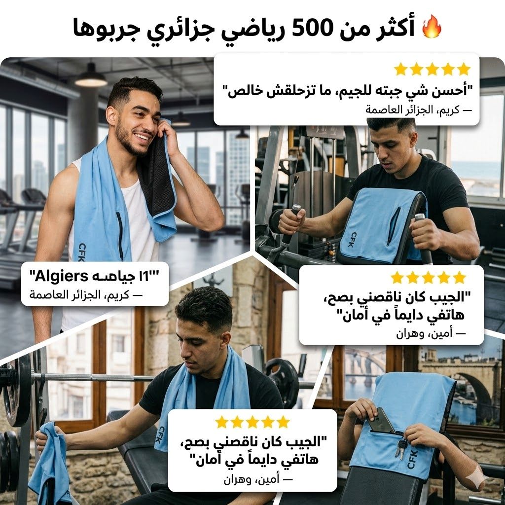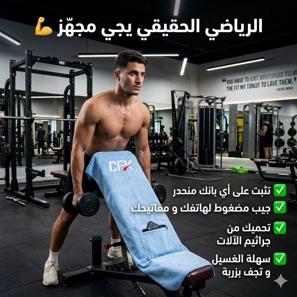 🔥 سيرفيات جيم ذكية تثبت على البانك و ما تزحلقش أبداً 💪 تحميك من ميكروبات الآلات 🦠 فيها جيب لهاتفك و مفاتيحك 🎒 و تقدر تعلّقها على كامل لي بو تاع صالة 🔧 مايكروفايبر تمص العرق و تنشف بسرعة ⚡ و الدفع عند الاستلام 🇩🇿✅