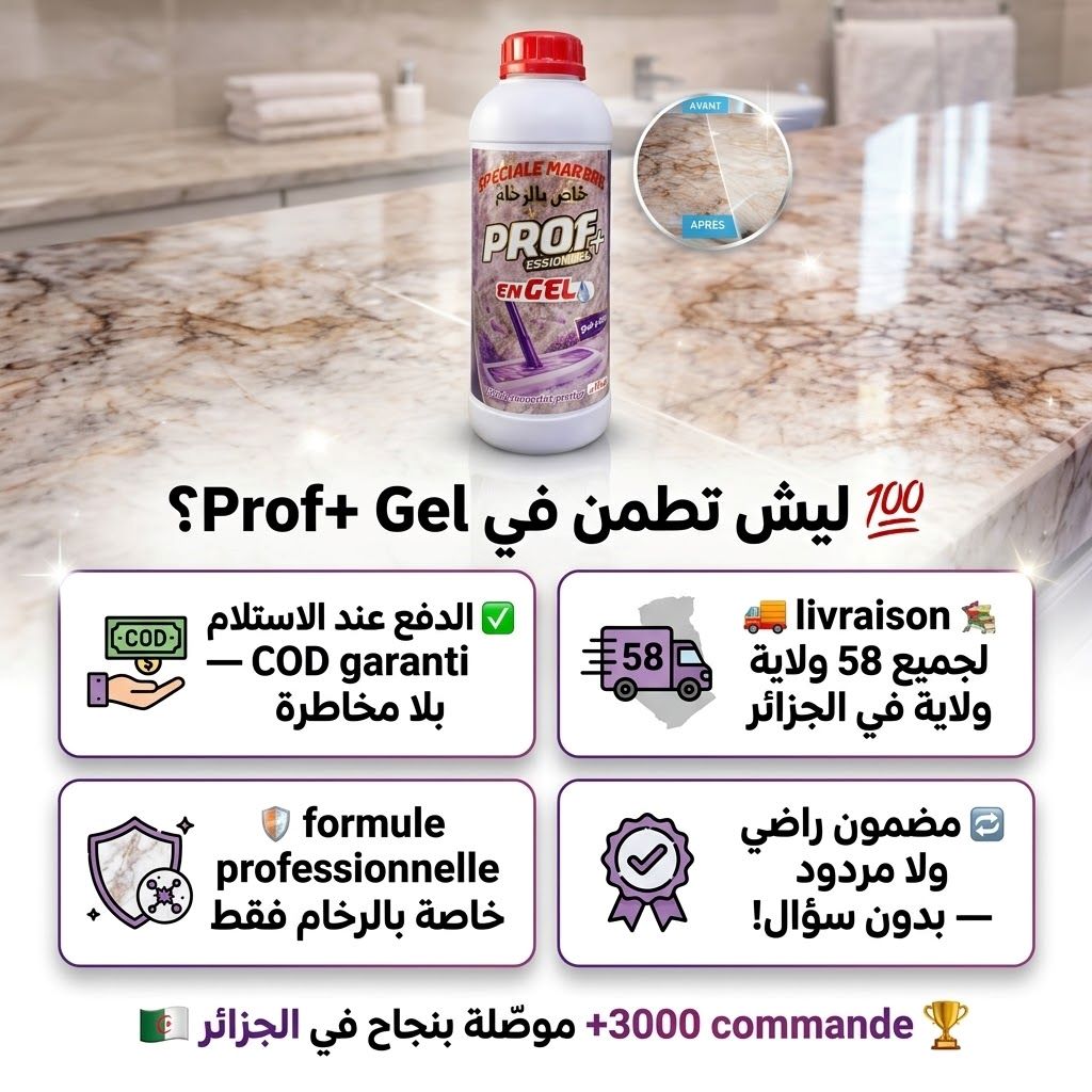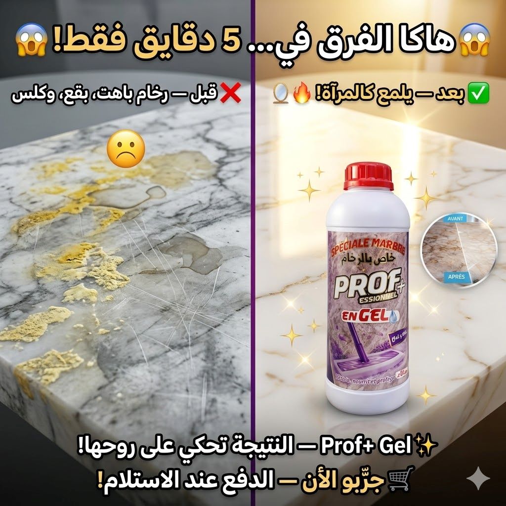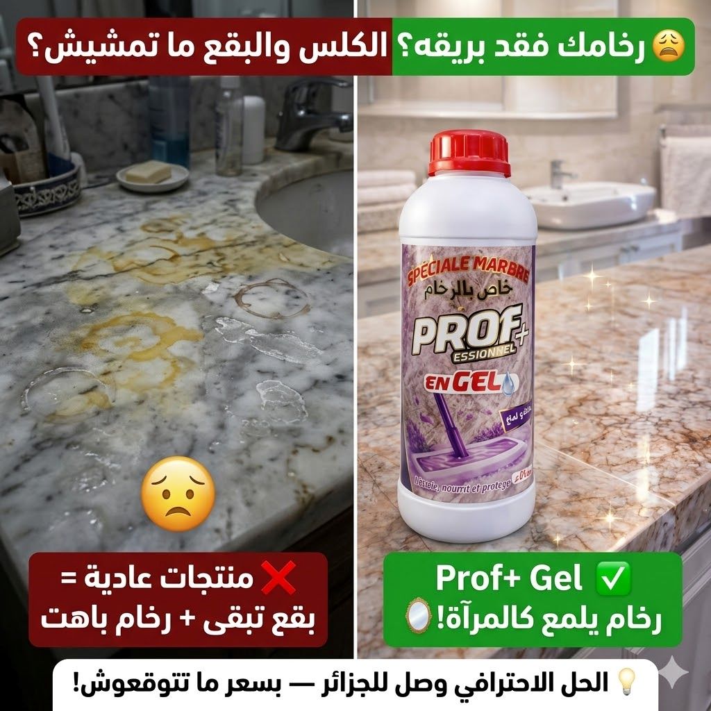 رخامك باهت وفيه بقع وكلس ما تمشيش؟ 😩💔 هاك الحل اللي تدوري عليه من زمان! Prof+ Gel — المنظف الاحترافي خاص بالرخام 💜🧴 في 5 دقايق فقط رخامك يرجع يلمع كيما يوم شريتو! 🪞🔥 ينظف + يجلّي + يحمي — كل شي في منتوج واحد! 💯 بدون تعب بدون جهد وبدون حكايات! ⚡🌿 آمن على جميع أنواع الرخام 🛡️ livraison لباب الدار والدفع عند الاستلام ✅🚚 اطلب الأن قبل ما يخلص! 🔥⚠️😎