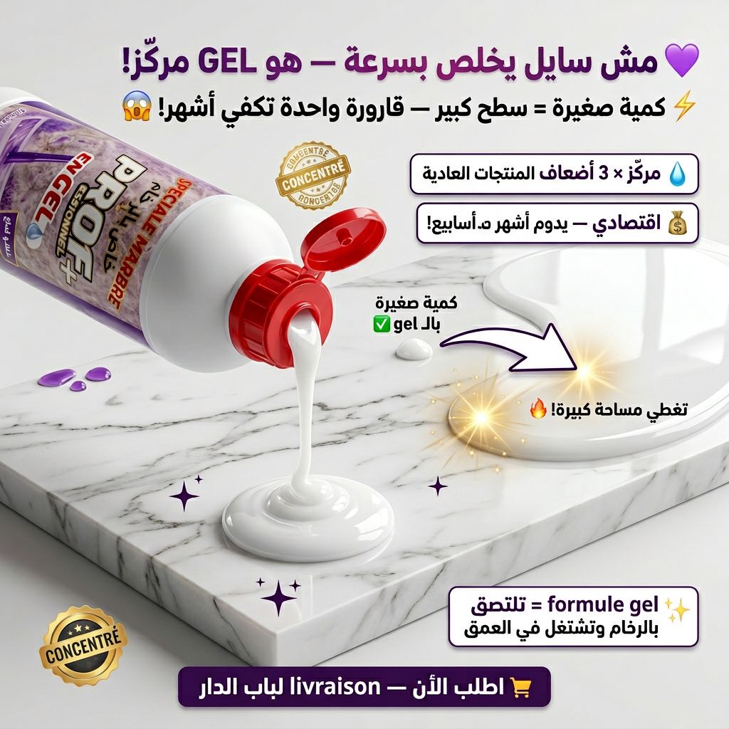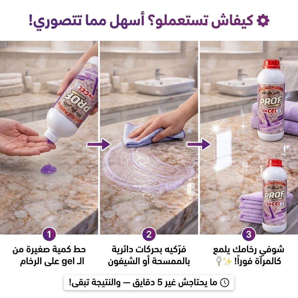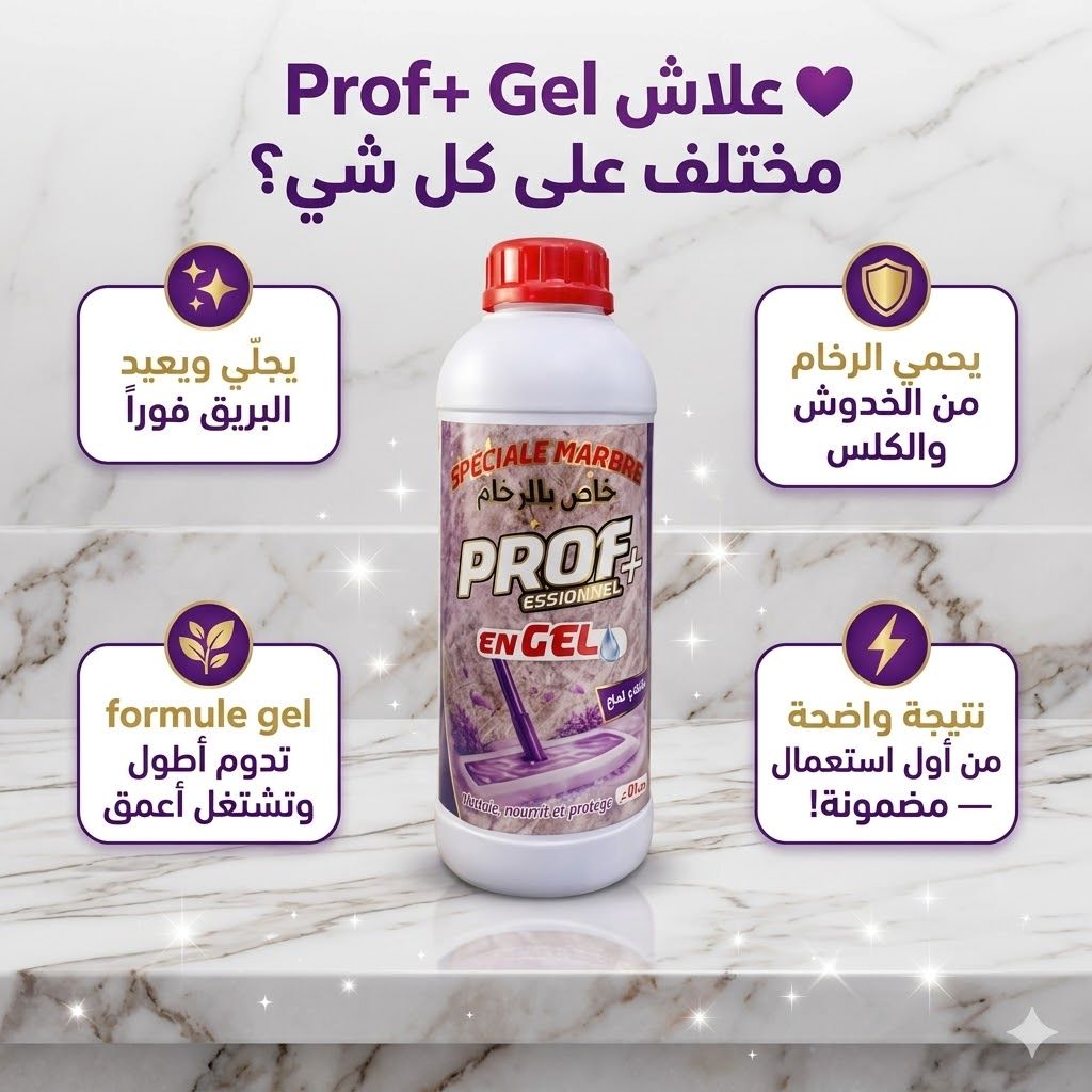 رخامك باهت وفيه بقع وكلس ما تمشيش؟ 😩💔 هاك الحل اللي تدوري عليه من زمان! Prof+ Gel — المنظف الاحترافي خاص بالرخام 💜🧴 في 5 دقايق فقط رخامك يرجع يلمع كيما يوم شريتو! 🪞🔥 ينظف + يجلّي + يحمي — كل شي في منتوج واحد! 💯 بدون تعب بدون جهد وبدون حكايات! ⚡🌿 آمن على جميع أنواع الرخام 🛡️ livraison لباب الدار والدفع عند الاستلام ✅🚚 اطلب الأن قبل ما يخلص! 🔥⚠️😎